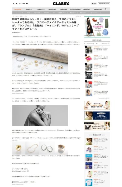 本日、女性向けファッションメディア「CLASSY.」のwebニュースにて、BEANTII Jewelryを取り扱っていただきました。