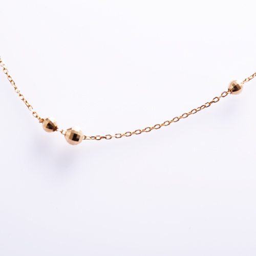 身体のシルエットに沿って流れるような曲線を描く洗練されたK18のチェーンに、あえて不規則にレイアウトされた繊細なカットが施された7つのsphere(球体)が光の反射を受けて煌めきます。sphere(球体)はスライドさせることができるシリコン入りで、止める位置によって様々な表情を楽しむことができます。